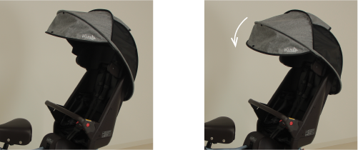 日よけ部分の調整は先端のツバ部分のみ調整(下す・上げる) ができます。 上げた時にボタンで固定できるようになっております。 ベビーカーの日よけ部分のように、大きく開閉できる構造ではありませんので、ご注 意ください。