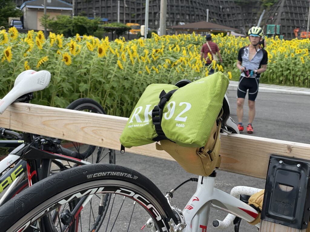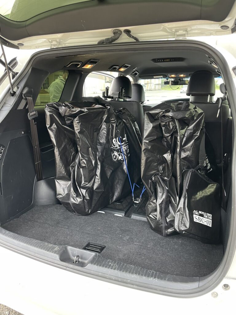 和歌山までは、会社のエスティマに新商品「車載用輪行袋(SBC-01)」に自転車を入れて高速道含む約250kmを移動。袋に付属の固定用ゴムフックでしっかり安定している事と生地素材のゴワツキ(硬さ)でガチャガチャ言う事もなく無事現地入り。※後輪を付けたままでも収納出来ますが、今回は2台+荷物の関係で前後輪を外して収納し余った生地をチェーンステーの間(後輪部分)に押し込んでいます。