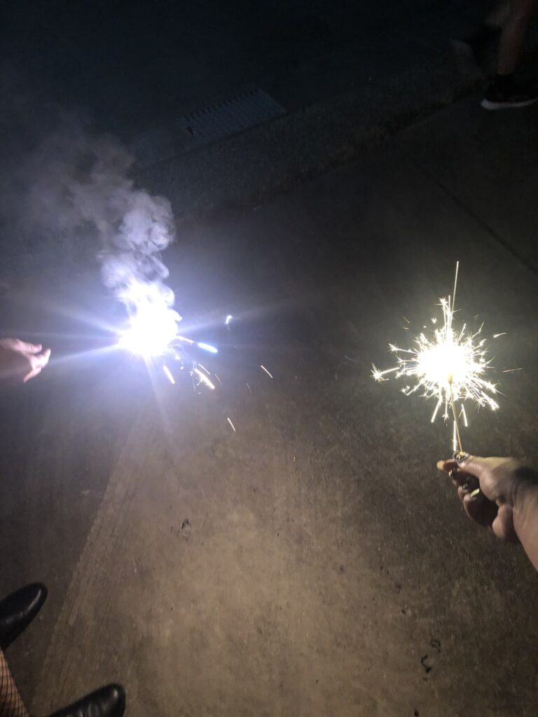 最近の手持ち花火は、写真撮影のため煙が少なめになっていたり、色が変わったり、噴射時間(?)が長いものなどがあるようです。最長1分とかの花火がありました。