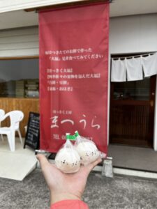 向島の次は因島!これがかの芸能人の出身地かぁとか思いながら、はっさく大福を食べることと下調べした割には、どこで食べるんやった?お店の場所忘れた?と、結構いい加減な行き当たりばったり。その上、得意の「まっいいか」「気にしない気にしない」と、早速に見つけたところで頬張りました。早どりの八朔で酸っぱいとのことでしたが、餡の甘さと相性よくてサッパリと頂けました。