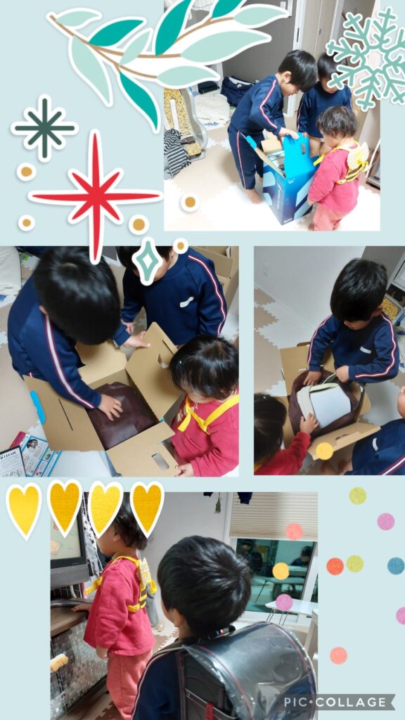 喜んでランドセル背負ったままテレビ見てます(´- `*)