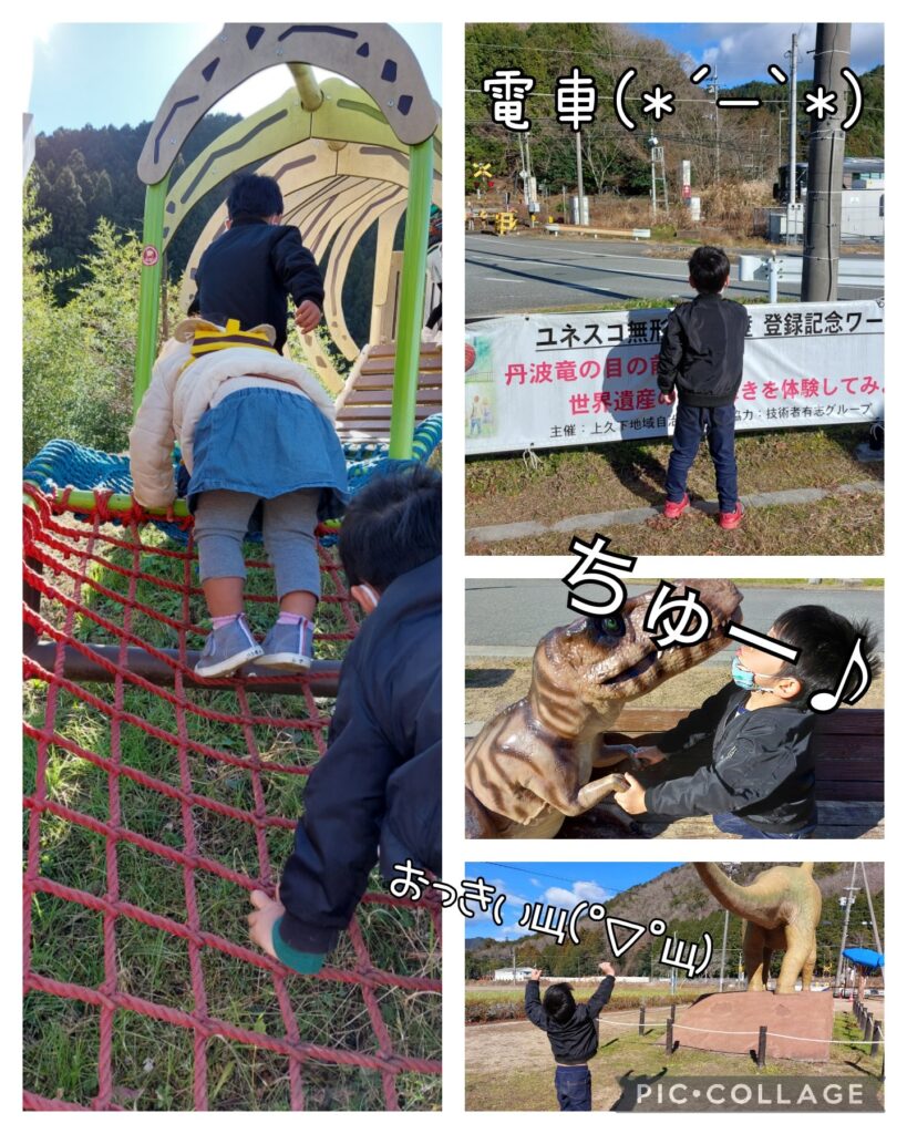 丹波竜の里公園には、大きな遊具が1つでした。恐竜の小型模型2個と巨大模型1個で、電車も見れて長男も満足でした☆