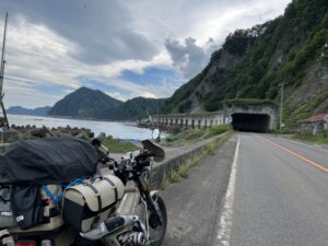 The road and the coast are much closer than in Atsunai on Route 336, and it is starting to rain lightly, mixed with the spray from the waves, so I take precautions and put on a kappa.