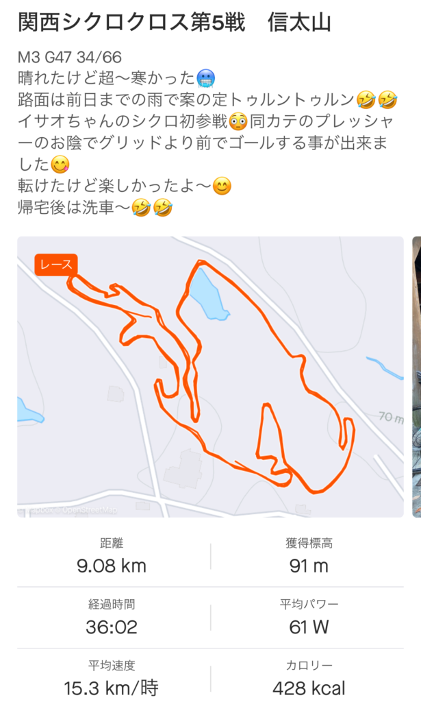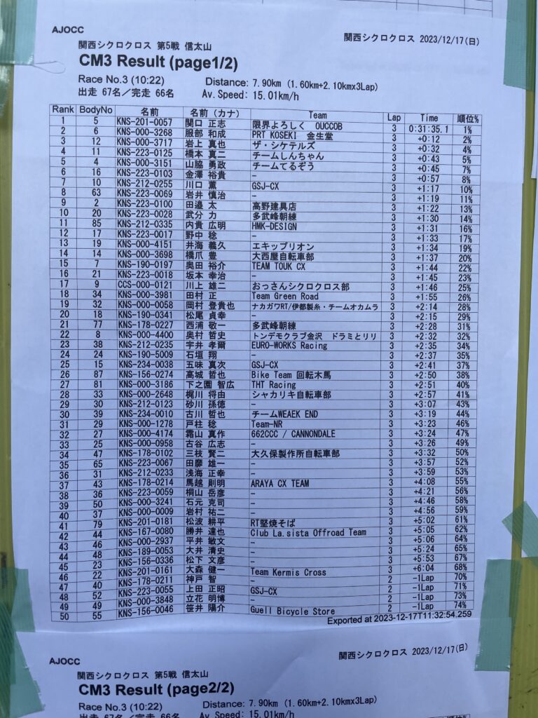 ブログ > スタッフのサイクリング日記 関西シクロクロス第5戦信太山に参戦! 投稿日 2023年12月17日 投稿者 サンちゃん 関西シクロクロス第5戦信太山に参加してきました~ M3 グリッド47 34位/66人 晴れたけど超〜寒かった 路面は前日までの雨で案の定トゥルントゥルン イサオちゃんのシクロ初参戦同カテのプレッシャーのお陰でグリッドより前でゴールする事が出来ました 転けたけど楽しかったよ〜 同級生と子供も交えて遊べるレースって楽しいね~w 帰宅後は洗車〜 #大久保製作所自転車部 #yamamaruto #sbc01 #canyon #canyoninflite #関西シクロクロス #関西シクロクロス信太山 ← ランチでこんな腹パンパンになることある? → 勝手に携帯使われ変な写真が…