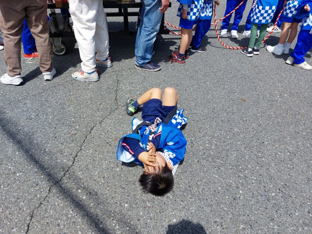 長女の足痛いから歩けない攻撃により、終始片方をおんぶして片方の手を繋ぎ御輿を追いかけました(´- `*)