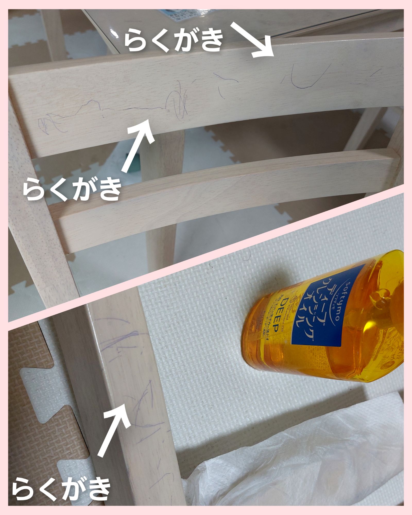うちのイスは、クレンジングオイルとハンドジェルとメラニンスポンジを使用して落とせましたが、イスの素材により色落ちや色剥げなどの危険もあるので、お試しになる時はくれぐれも自己責任でお願い致します。