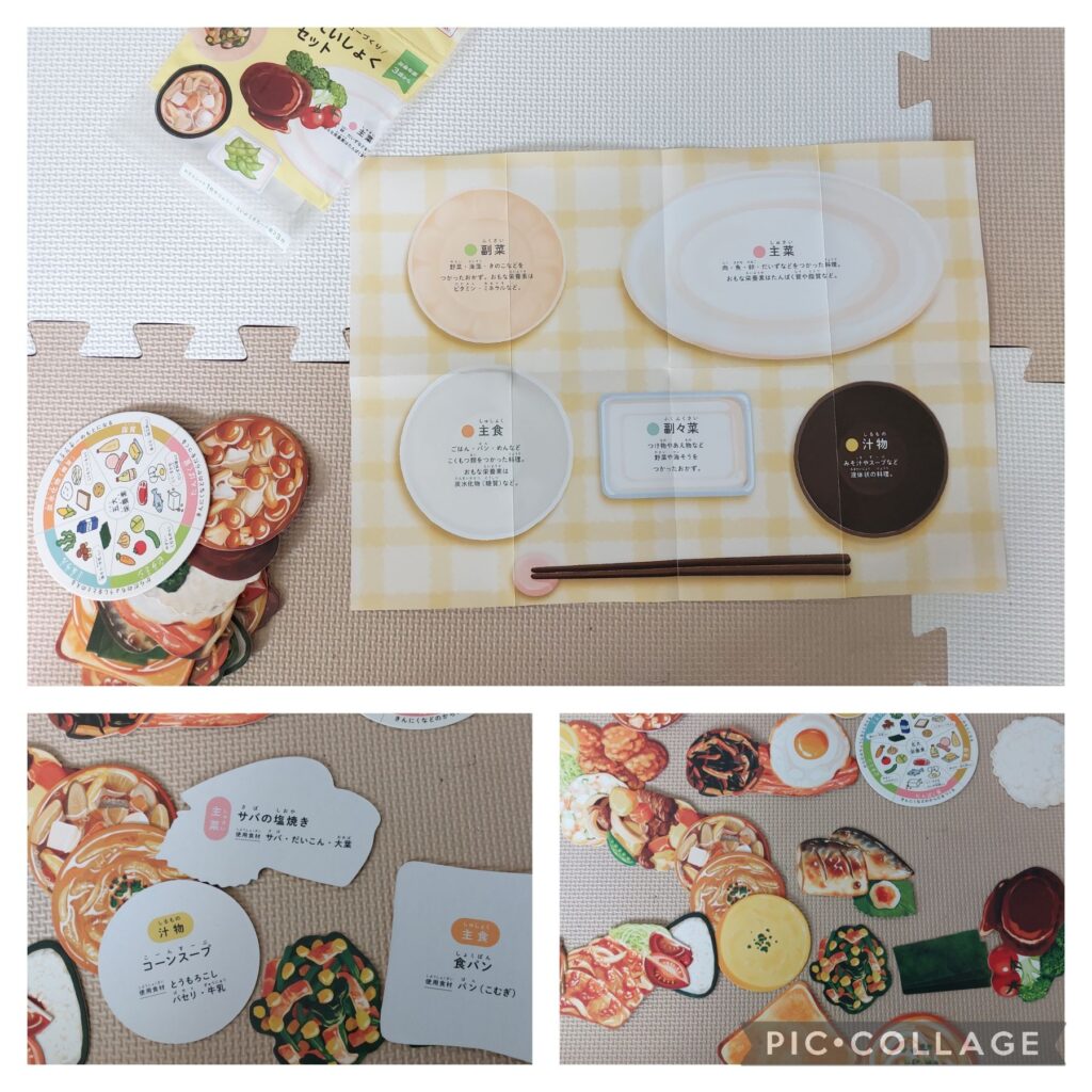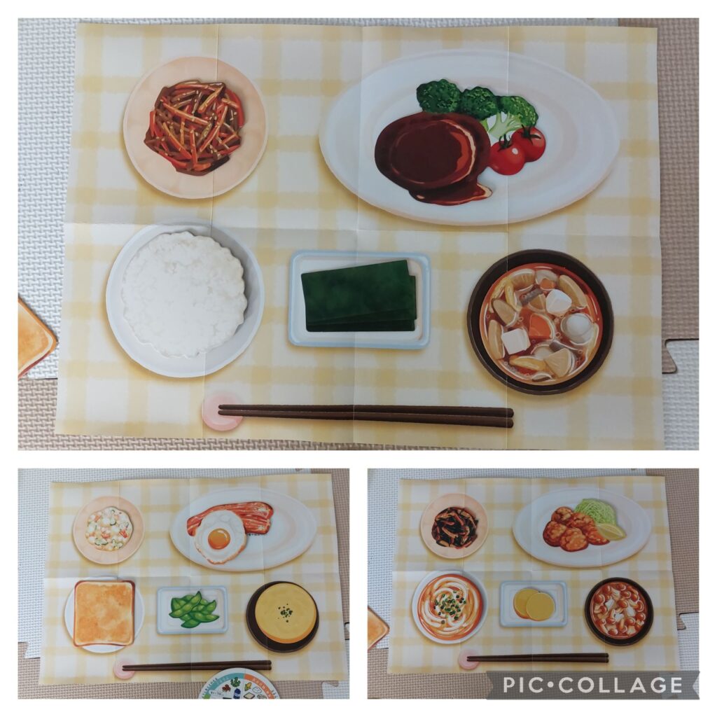 スゴ…定食セット。バランスよくシートに置くと栄養のお勉強になる!料理の裏には、汁物、主食など書いてあり、置く位置が分かるようになってる(゜ロ゜)