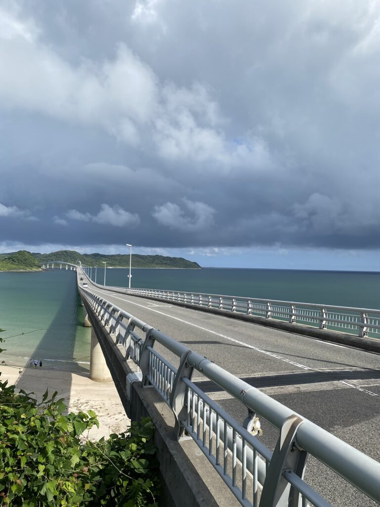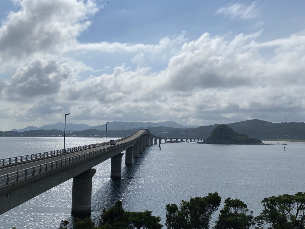 I stayed at Yumoto Onsen yesterday. On the way from Yumoto Onsen to Tsunoshima Ohashi (Tsunoshima Bridge), I discovered a straight stretching out road —what they call a “super farm road.”