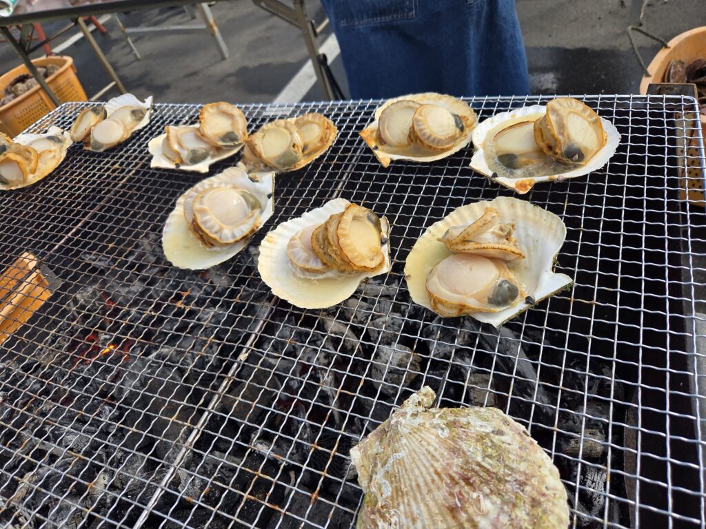 ここでは焼きたてのホタテをいただき、そのあと、路面デコレーション用のチョークに使用するためのホタテの殻を砕くというイベントに参加。