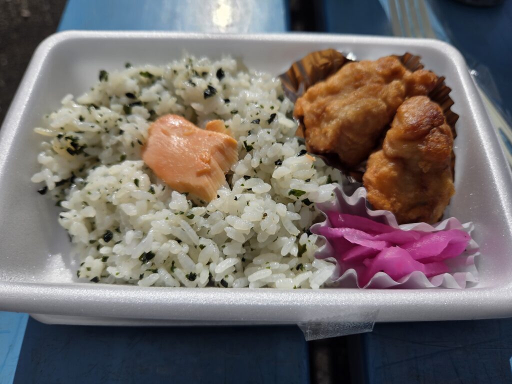 焼き鮭とわかめご飯、唐揚げも柔らかくておいしい。