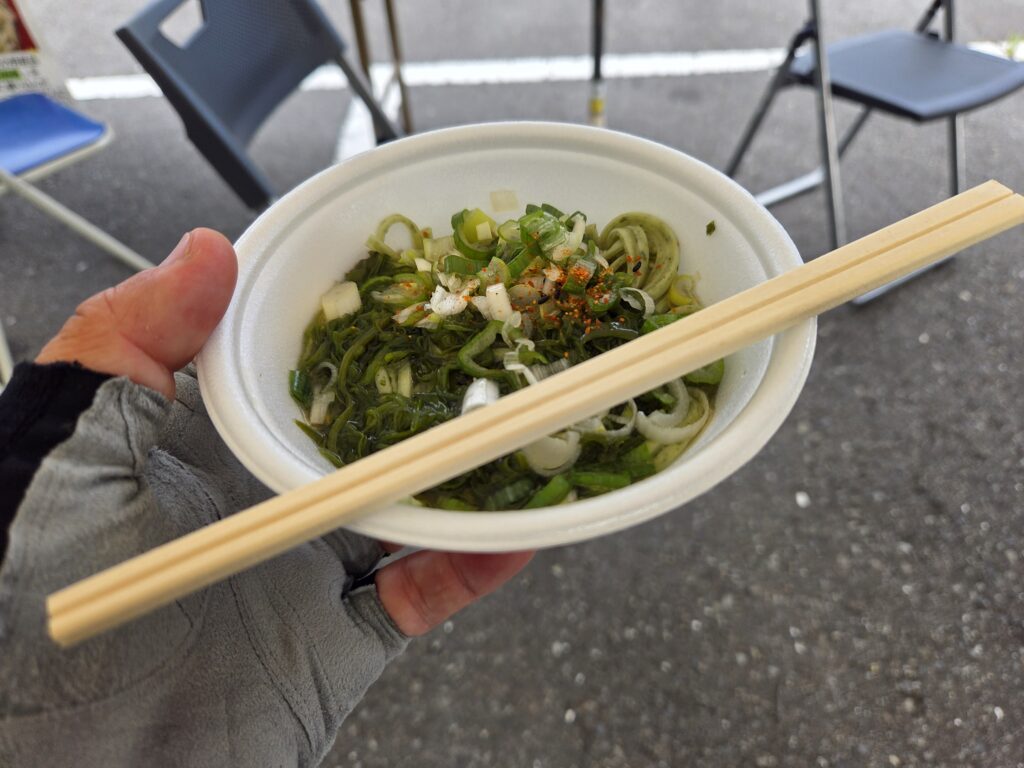 ここのエイドは、味付けめかぶがトッピングされた冷やしわかめうどん。
