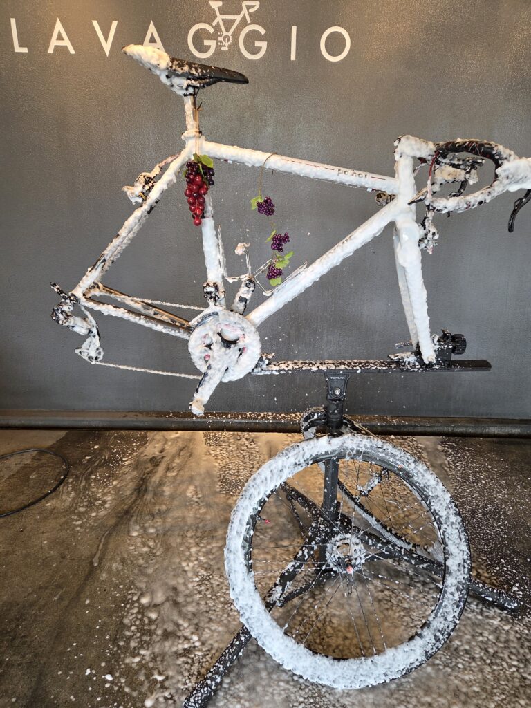 洗剤で泡々になる自転車(撮影用にブドウの飾りがw)