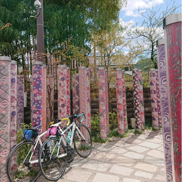 「キモノ・フォレスト」とは…? 京友禅の生地をアクリルで包み高さ約2mのポールにしたものを駅構内や線路脇のいたる所に設置し、京友禅の林に見立てたもの。 嵐山駅の敷地全体を覆い尽くす京友禅の柱はなんと600本もあるそうだ!