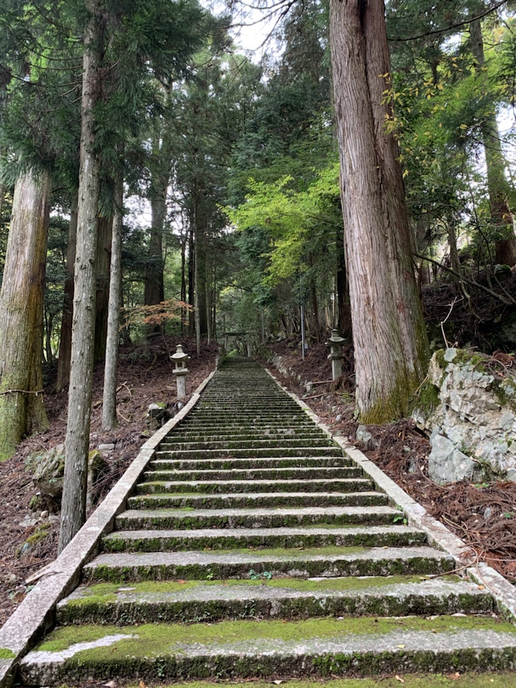 この苔むした階段の先に岩上神社のお社と「磐座」のパワースポットがあります。