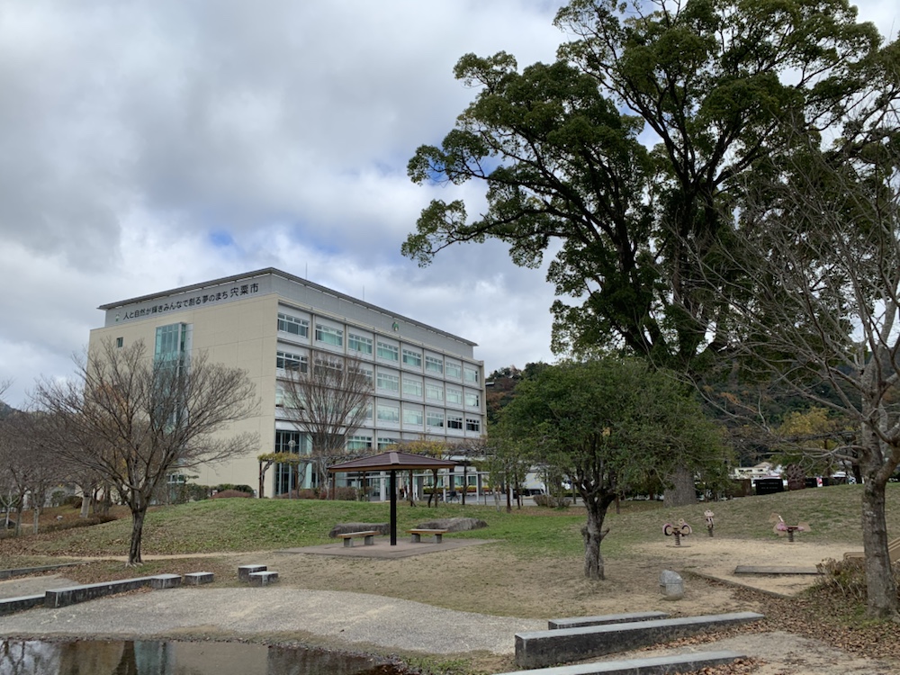 宍粟市市役所です。ここの駐車場は、休みの日は、ガラガラ!観光課に問い合わせて、了解をもらいました。「休日は、いくらでも自動車を止めても良いよ。」との事です。