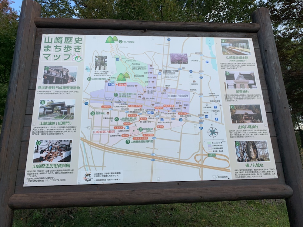 紅葉山を少し降ると、山崎町の旧城下町の雰囲気が残る「造り酒屋通り」に出ます。白壁が、至る所に残っていて観光スポットになっています。