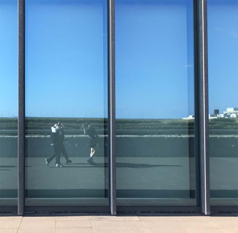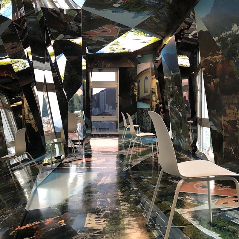 展示室は4階まであって、4階は周辺の景色と摩耶山が融合した空間?のような感じで、鏡がランダムに組み合わされた壁がすごく不思議な感じでした。