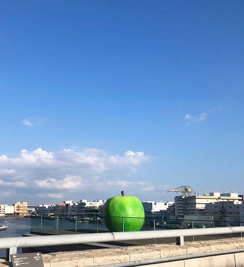 美術館の海側のデッキにある安藤忠雄作の「青りんご」も見てきました。海と空のブルーに映えてとってもキレイ。