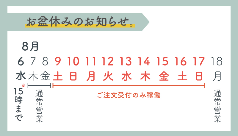 夏季休業前の商品の発送は8月6日(水)15:00時点までのご注文分を8日(金)に発送します。