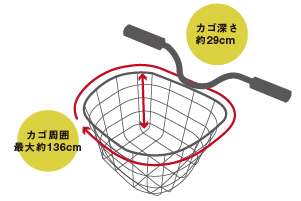 | 適応カゴサイズ | 周囲100~147cm程度 丸カゴ・角カゴ兼用 : 一般カゴ~電動アシスト用前カゴ(新聞カゴには取り付けできません) |