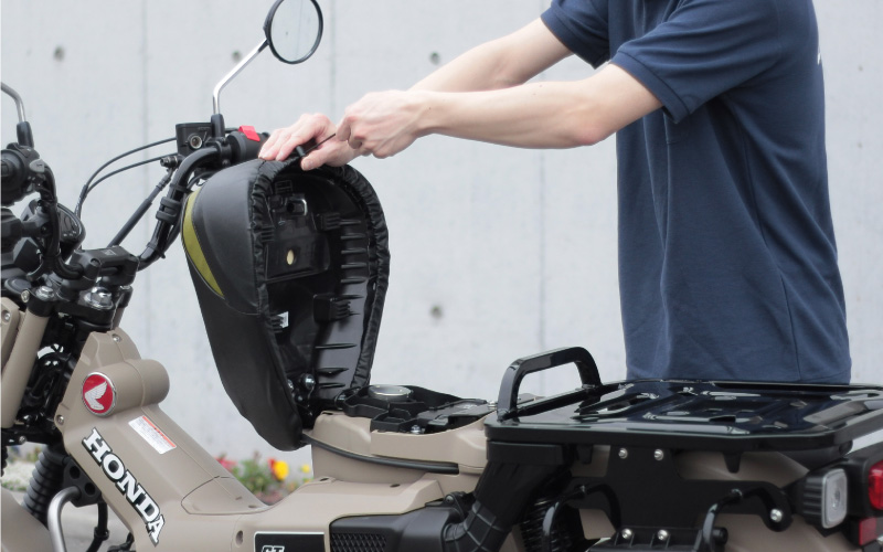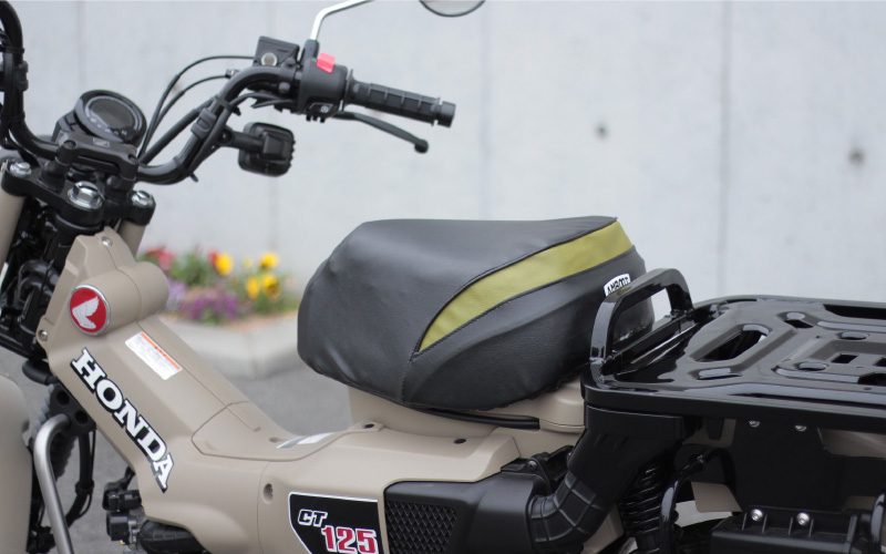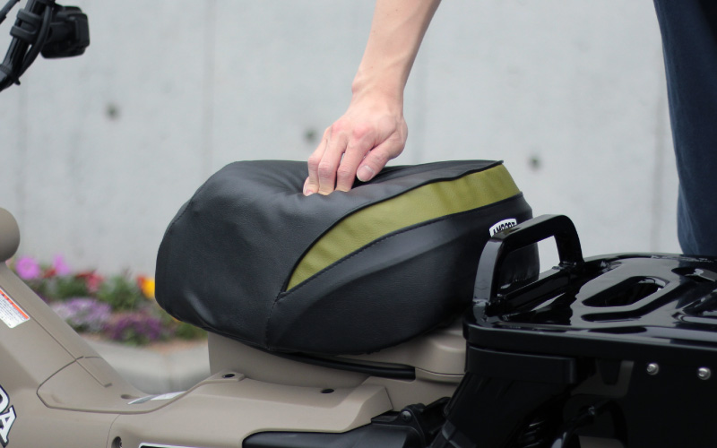 | 適応車種 | ※シートの上にクッションを重ねて使用する商品です。座面が高くなり足つきが悪くなる場合があります。不安な場合は、購入をお控えください。 純正シートに合わせて企画しております。それ以外のシートに取り付ける場合、装着できる保証はありません。 【HONDA / ホンダ】 ・ハンターカブCT125(JA55/JA65) ・クロスカブ50(AA06) ・クロスカブ110(JA45) ・クロスカブ110(JA60) ・スーパーカブ C125(JA58) ・スーパーカブ50(AA07) ・スーパーカブ110(JA44) ・スーパーカブ110(JA59) ・リトルカブ(AA01) |