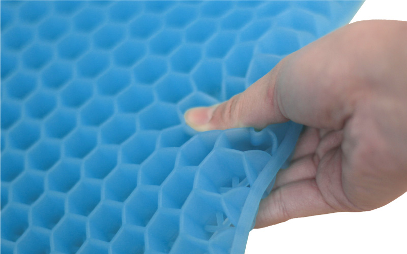 ゲルクッションはハニカム構造!体にかかる負担を吸収、分散。衝撃吸収力が高く、卵を押し付けても割れません。※衝撃吸収の感じ方の程度には個人差があります。