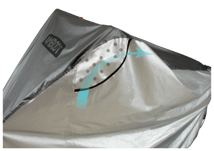 従来のカバーはクシャクシャに置いた状態だと、カバーの前後が分からずわざわざ広げる必要が…。このバイクカバーならシルバーの生地から見えやすいオレンジの持ち手とファスナーで、カバーを広げる必要なし!一目で前後が分かります。