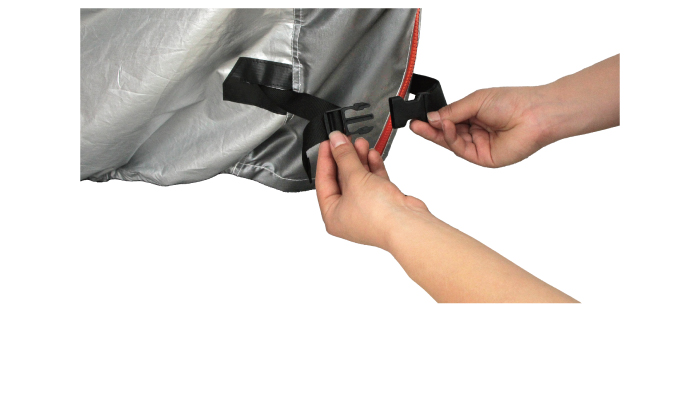 センターバックル付きのバイクカバーだと、エンジン部分にくっついて溶けたり、綿生地のついていない部分に高温部が触れてカバーが溶けてしまったり…。何よりつけ外しがとても面倒!そんな時間を短縮するために一度絞ればもう緩める必要がないスソ絞り機能を採用。