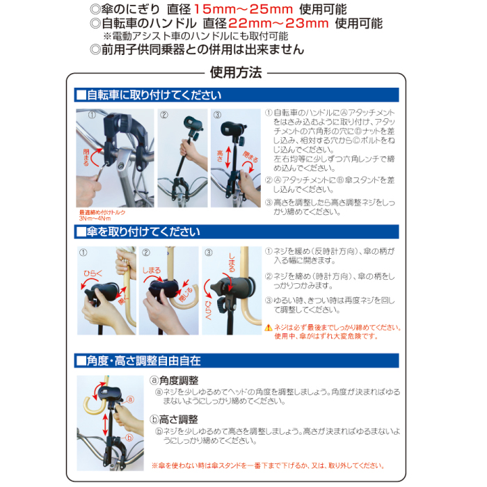 | サイズ | 傘のにぎり【直径15~25mm】 自転車のハンドル【直径22~23mm】 |