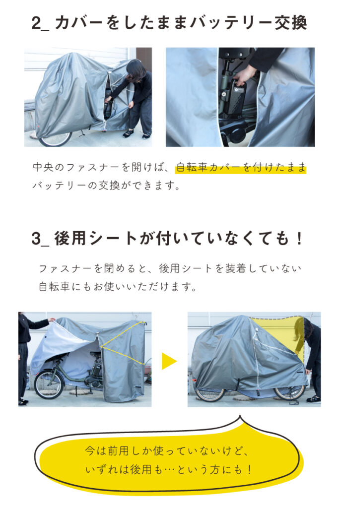 | 商品の特徴 | ・レインカバーを付けたままで取り付けられる ・大きなファスナーでかけやすい ・お子さまが1人でも2人でも ・ロック穴 鍵穴付き盗難防止(※ワイヤーロックは別売りです) ・狭い場所でも使いやすい ・子供乗せ レインカバーを守る ・撥水加工 ・バタつき 防止 ・おしゃれなダークグレー ・3人乗り自転車・電動自転車に対応 ・干しやすいバックル付き |