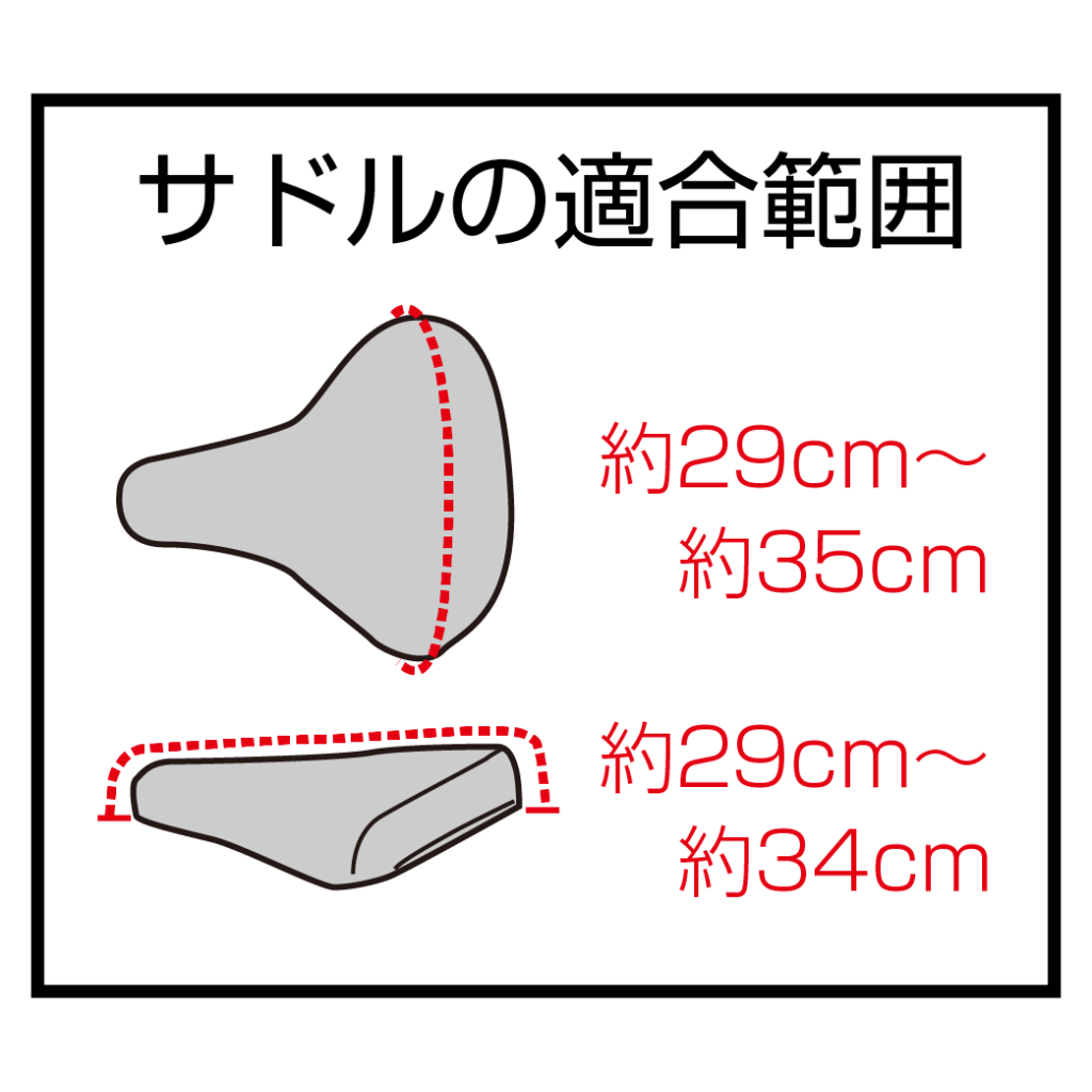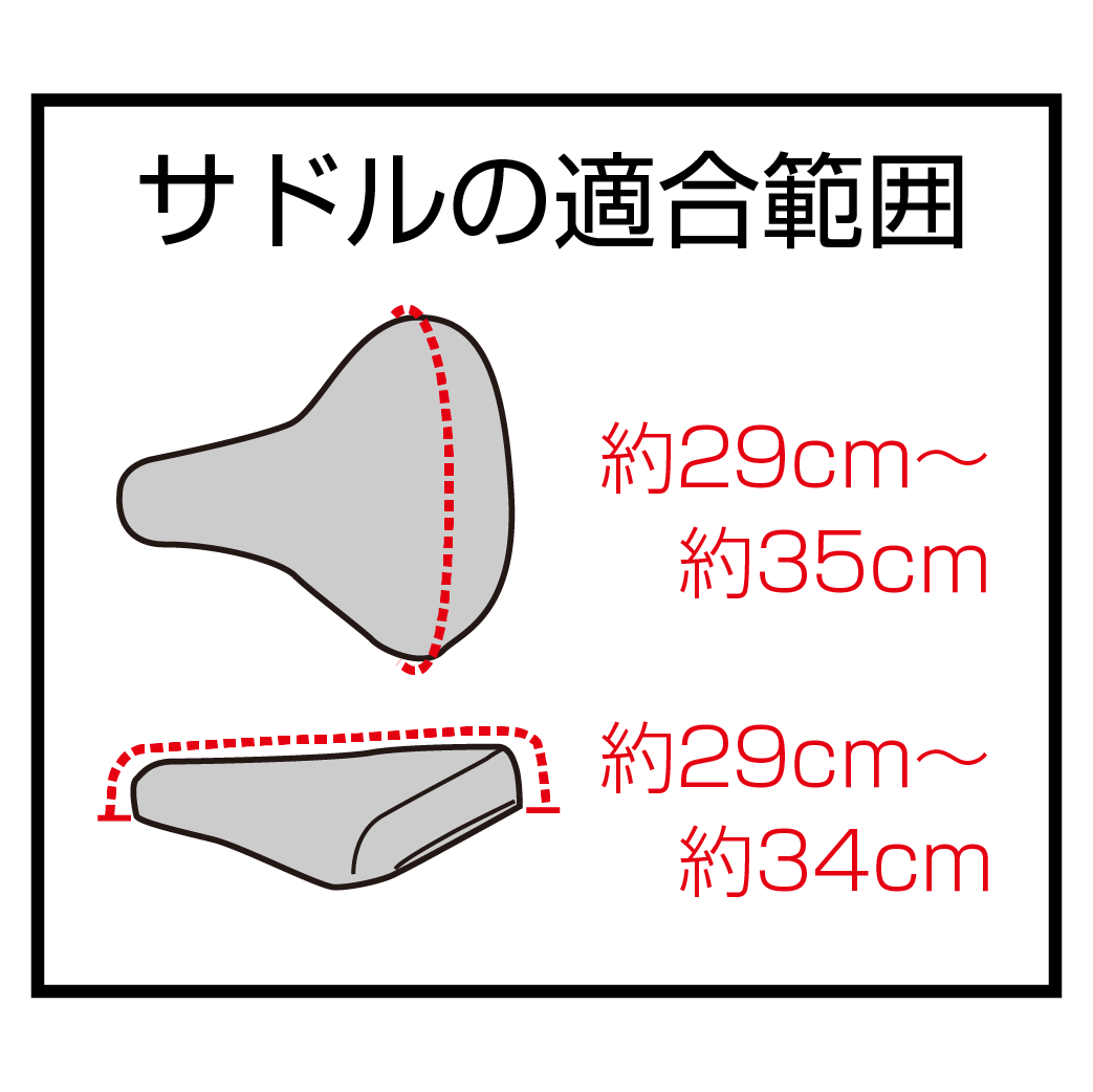 | 適応サドルサイズ | ![]() 電動アシスト車にも対応 一般サドル~少し大きめサドル(電動アシストサドル) ※スポーツサイクル及び特殊サドルには適合しません ※エアロバイクには適合しません |