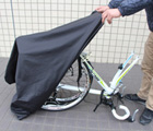 ファスナーを全開にし、カバーを自転車後方より前方におおいかぶせ、サドルが隠れるようにカバースソを整え、ハンドルを切ります。