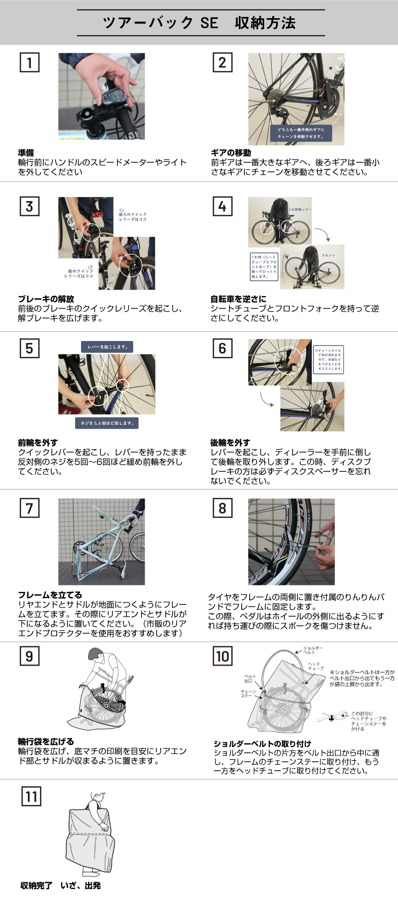 | 商品の特徴 | 巾着タイプ 自転車の出し入れに場所を取らない省スペース輪行袋 |