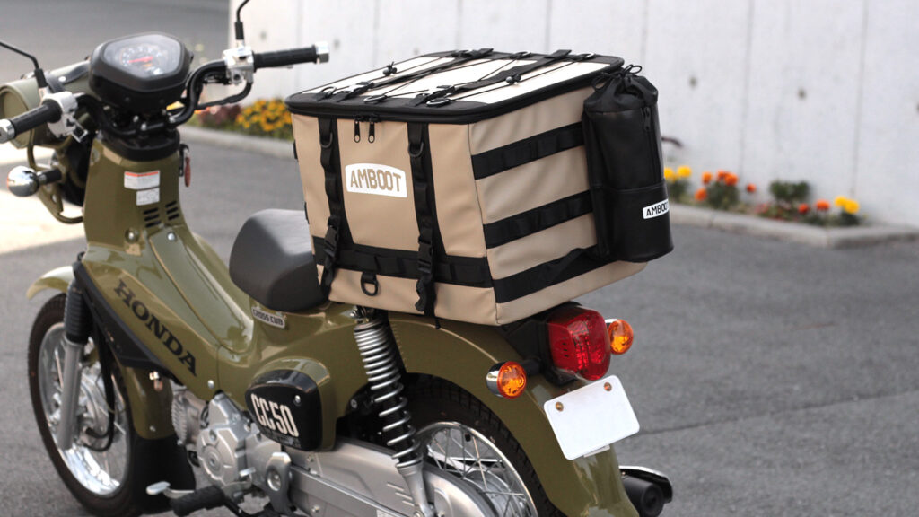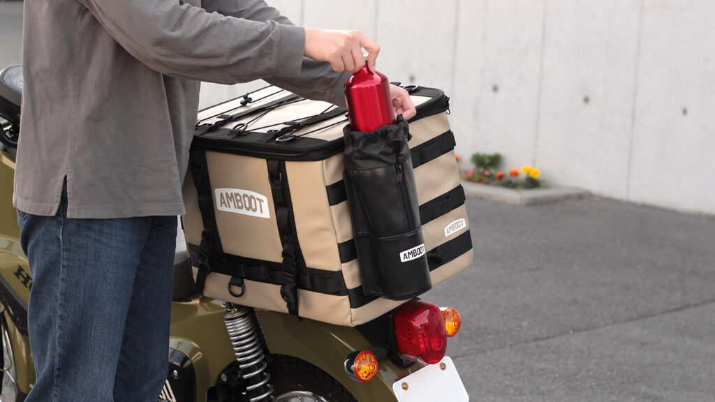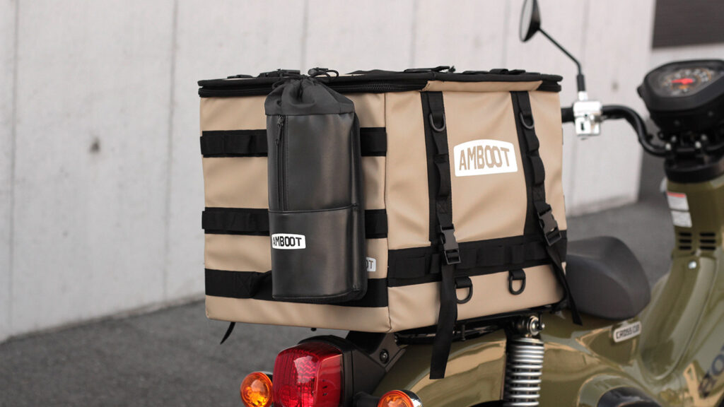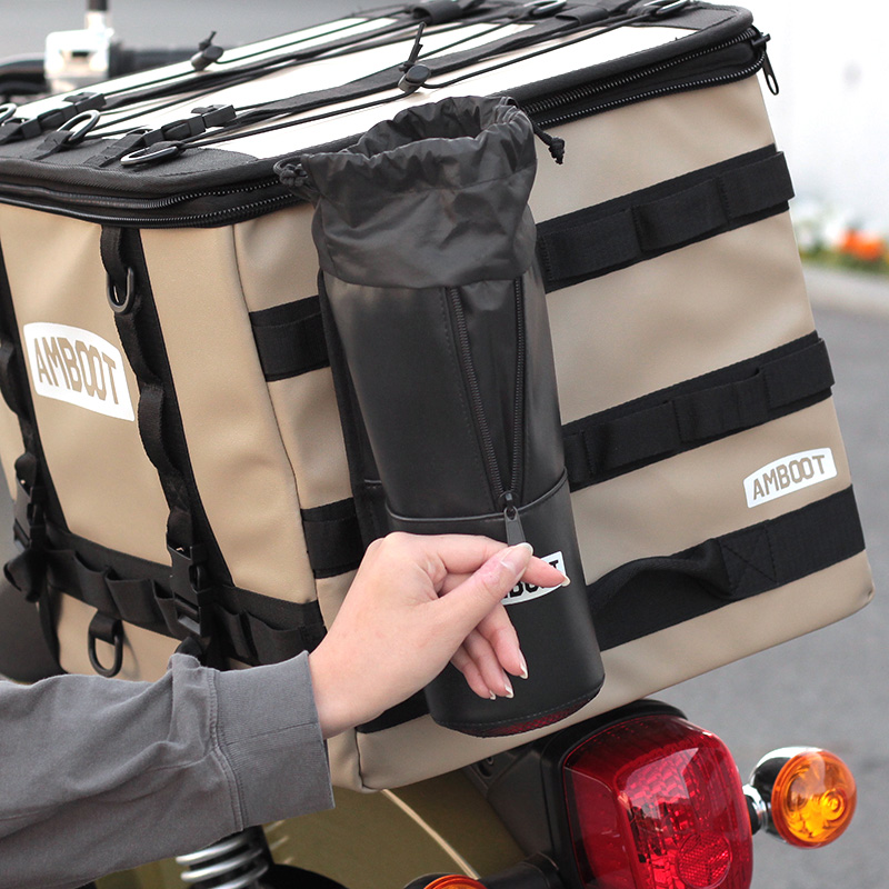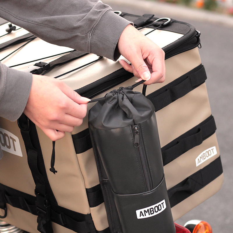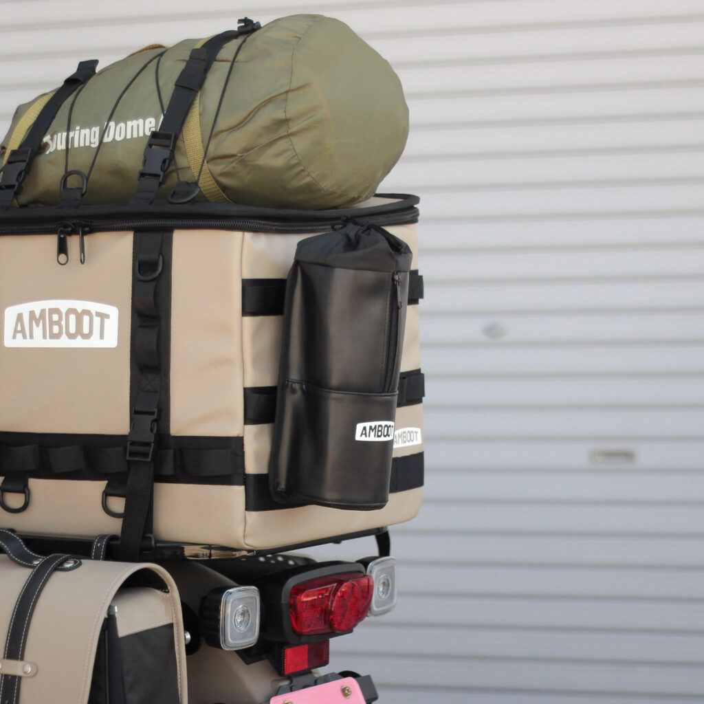 | 商品の特徴 | ・外付けできるから中の荷物がガソリン臭くならない! ・AMBOOTのリヤボックスEXにぴったり ・巾着タイプで開け閉めカンタン ・底がメッシュ素材で水が溜まりにくい |