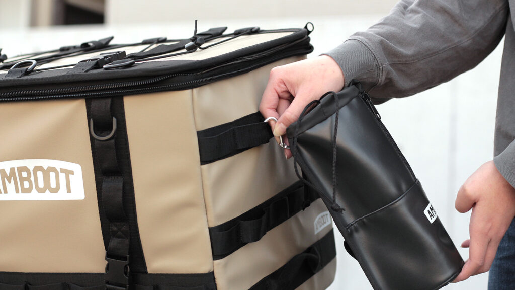 | 適合 | AMBOOTリヤボックスEX(品番:AB-RBEX01) リヤボックスEXでなくても、カラビナなどでいろいろなところに取り付けることができます。 ※走行に支障が出ない位置に取り付けを行ってください。 ※汎用品ではありますが、車種や仕様によっては装着できない場合がございます。 |