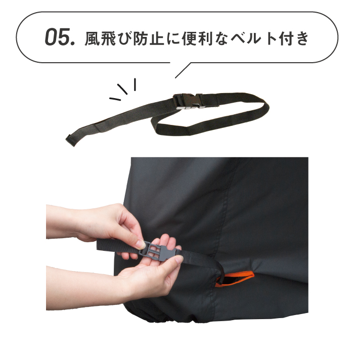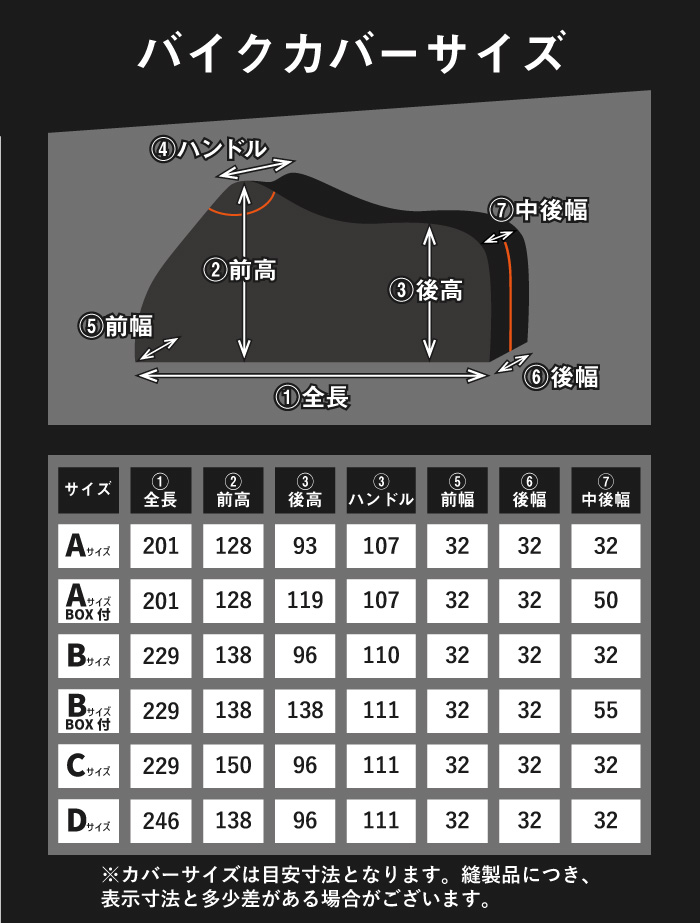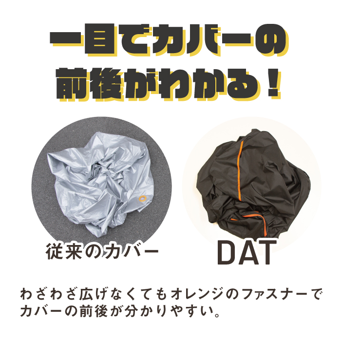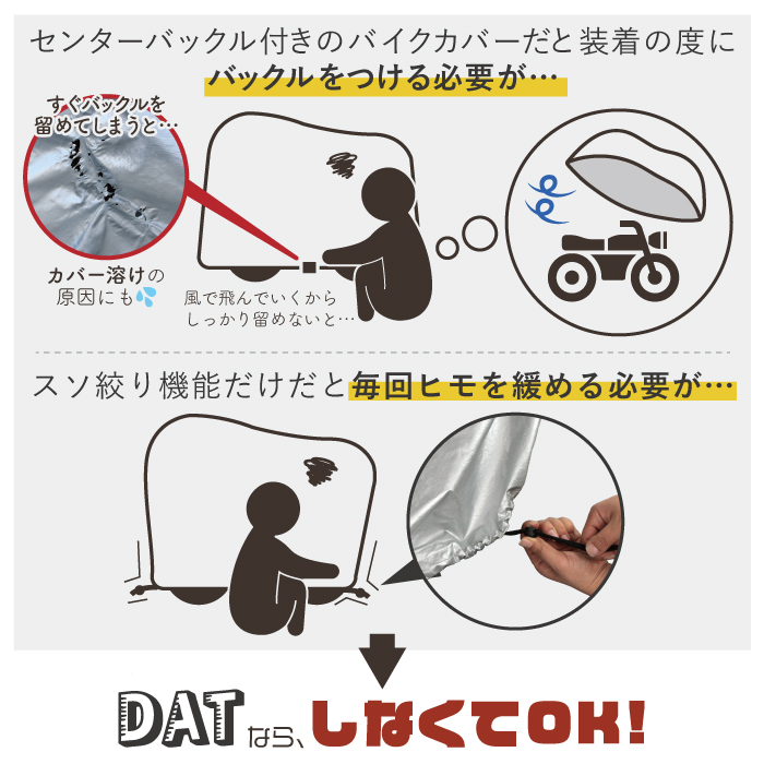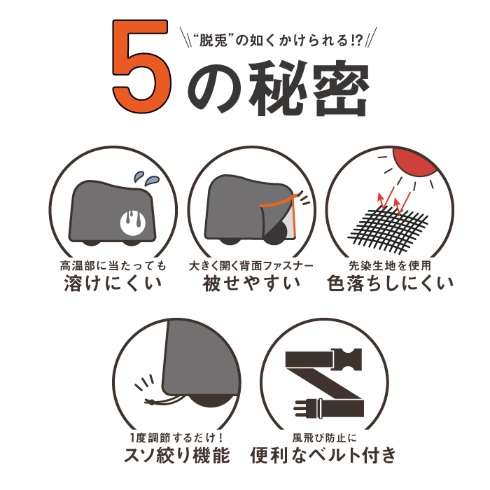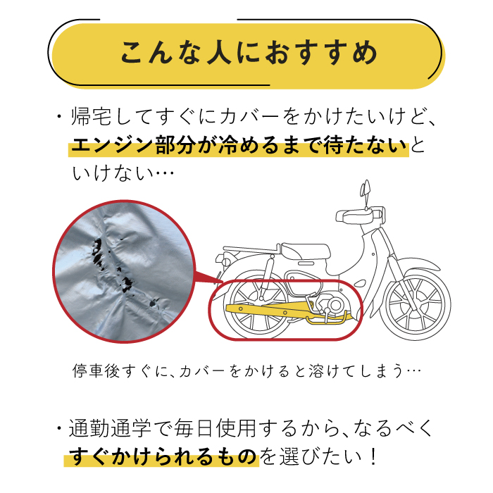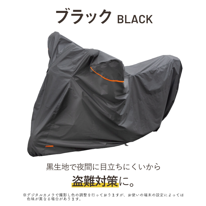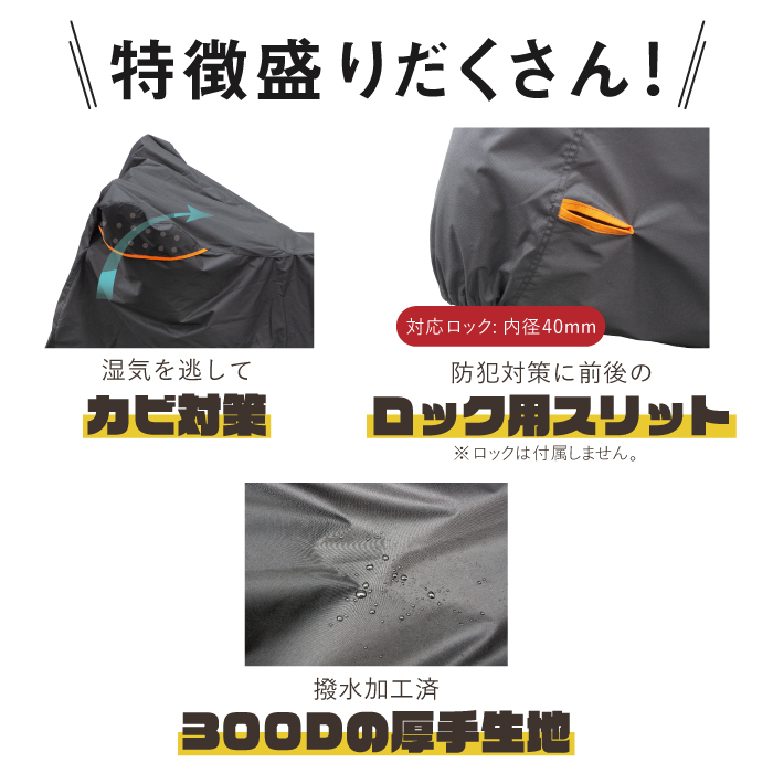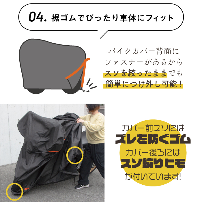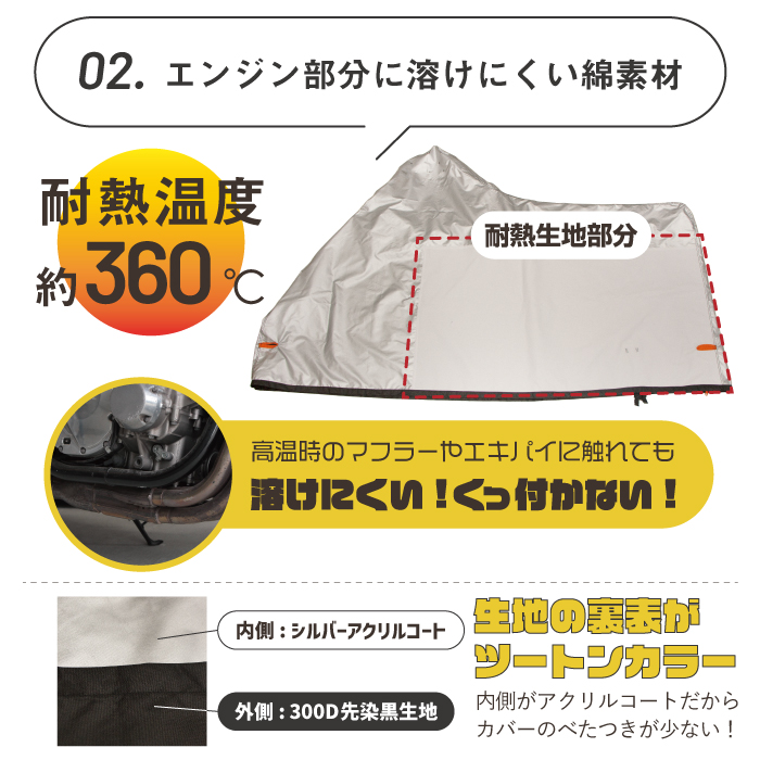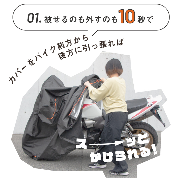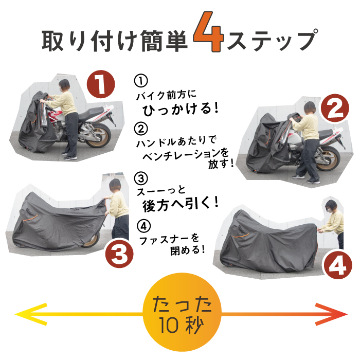 | 商品の特徴 | ◇たったの10秒でバイクカバーがかけられる。 ◇色落ちしにくい先染めの黒生地を使用。 ◇オレンジのベンチレーション(通気口)とファスナーでカバーの前後が分かりやすい。 ◇カバー内側に耐熱温度約360℃の溶けにくい綿素材を使用。エンジンを冷ます時間を待たなくてもいい! |