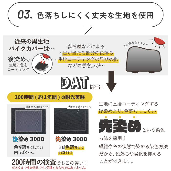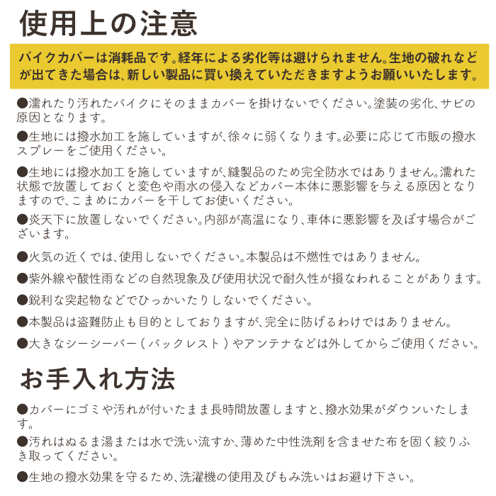 | 注意 | ●バイクカバーは消耗品です。経年による劣化等は避けられません。生地の破れなどが出てきた場合は、新しい製品に買い換えていただきますようお願いいたします。 ●本製品は盗難防止も目的としておりますが、完全に防げるわけではありません。 ●紫外線や酸性雨などの自然現象及び使用状況で耐久性が損なわれることがあります。 ●鋭利な突起物などでひっかいたりしないでください。 ●炎天下に放置しないでください。内部が高温になり、車体に悪影響を及ぼす場合がございます。 ●火気の近くでは、ご使用しないでください。本製品は不燃性ではありません。 ●生地には撥水加工を施していますが、徐々に弱くなります。必要に応じて市販の撥水スプレーをご使用ください。 ●生地には撥水加工を施していますが、縫製品のため完全防水ではありません。濡れた状態で放置しておくと変色や雨水の侵入などカバー本体に悪影響を与える原因となりますので、こまめにカバーを干してお使いください。 ●濡れたり汚れたバイクにそのままカバーを掛けないでください。塗装の劣化、サビの原因となります。 ●大きなシーシーバー(バックレスト)やアンテナなどは外してからご使用ください。 |