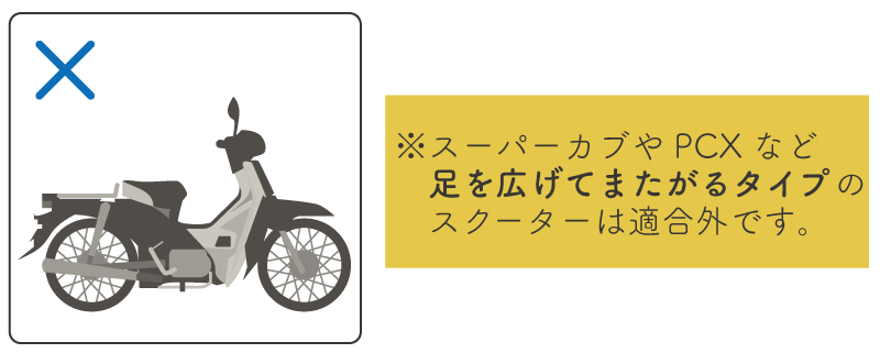 | 適応車種 | 50cc~125ccクラスのステップが平らなスクーターに対応 ※スーパーカブやPCXなど足を広げてまたがるタイプのスクーターは適合外です。 |