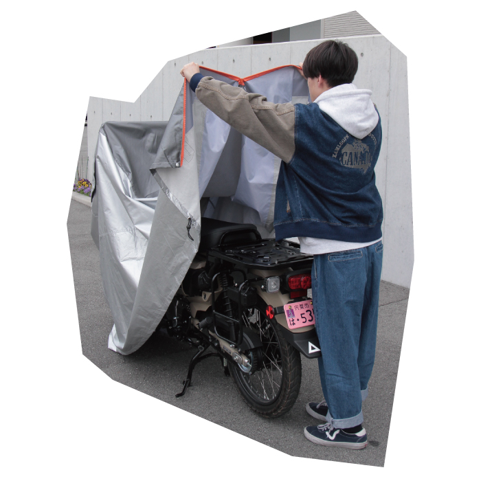 | Product Characteristics | ・Only 10 seconds to cover! ・Easy to recognize the front and back of the cover with the orange handle and back zipper ・Heat resistant cotton material that does not melt with a temperature of about 360°C is used on the inside of the cover. No need to wait for the engine to cool down. ・A drawstring at the bottom, which, once tightened, no longer needs to be loosened. ・Belt included to prevent the cover from flying away in the wind and convenient cover storage → Space-saving cover storage! No dirty covers when storing! |