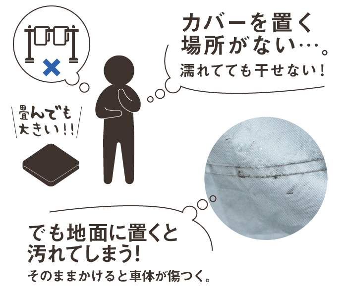 Many people have trouble finding a place to store motorcycle covers because they are so large. In an apartment or condominium, there is no place to put the cover except on the balcony of your room or on the ground of the shared bicycle parking lot….But when you put it on the ground, it gets dirty with sand and dust. In addition, when you use the cover next time, the dirt gets on the motorcycle and the cover is worthless!