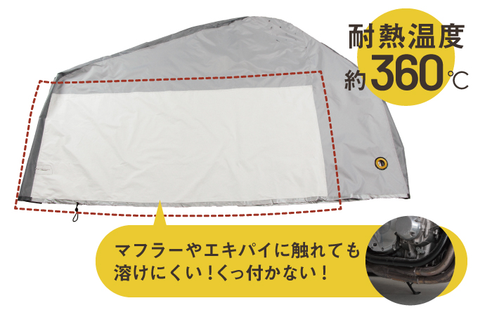 Generally, heat-resistant motorcycle covers use cotton fabric only where there is contact with the muffler, but our quick-covering motorcycle cover uses cotton fabric to cover a wide area that may get hot.
