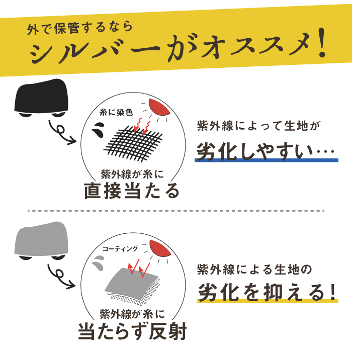 | Caution | ・Motorcycle covers degrade over time. Deterioration is inevitable. If you see any tears or cracks in the fabric or parts, please purchase a new one. ・This product is intended to prevent theft, but cannot be expected to do so completely. ・Durability may be impaired by natural phenomena such as ultraviolet rays and acid rain, as well as by usage conditions. ・Do not scratch with pointed objects. ・Do not leave the product under strong sunlight. The inside of the cover may be hot and affect the motorcycle adversely. ・Do not use near fire. This product is not nonflammable. ・The fabric is treated with a water-repellent finish, but it gradually becomes weaker. Use a commercial water repellent spray if necessary. ・Although the fabric is treated with a water-repellent finish, it is not completely waterproof because it is a sewn product. Please dry the cover frequently, as leaving the cover in a wet condition may cause discoloration, rainwater intrusion, or other damage to the cover. ・Do not cover a wet or dirty motorcycle as it is. It will cause deterioration of the paint and rusting. ・Please remove large sissy bars (backrests) and antennas before use. |