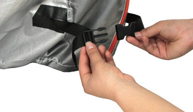 Many motorcycle covers have a center buckle to prevent it from flying away in the wind.