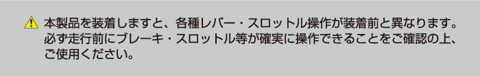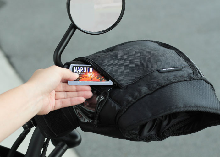 | 注意 | ●ハンドルカバーを装着し走行される前には、必ずアクセルの回転、ブレーキ操作などに支障がないかご確認ください。 ●汚れがつきましたら、少し水分を含ませた布等で軽く拭き取ってください。もみ洗いや洗濯機の使用はお避けください。 ●雨などに濡れた時は、ハンドルカバーを取り外し陰干ししてください。 ●本製品は防寒用です。縫製品につき完全防水ではありません。 ●ポケットに貴重品等を入れないでください。ファスナー部分から雨水が浸水する場合がございます。 ●ご使用状況、経年劣化等により、機能が損なわれましたら新しいものをお求めください。 ※一部特殊ハンドルには取り付けできません。 |