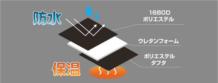 | 材質 | 表地:ポリエステル (裏 ウレタンコート) マチ:PVCレザー 中:ウレタンフォーム インナー:ポリエステルタフタ(裏 アクリルコーティング) |