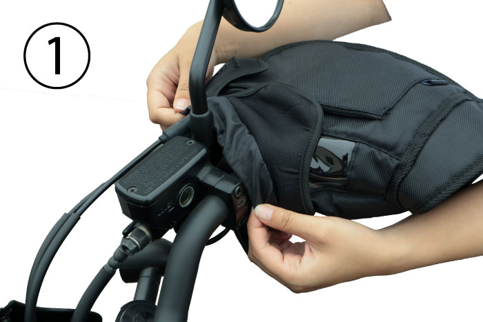 ②ミラーとスロットルワイヤーを切れ目を利用してかわし、面ファスナーで固定してください。