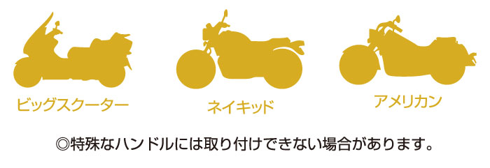 | 適応車種 | 大型スクーター~大型バイクにおすすめ! ・ビックスクーター ・ネイキッド ・アメリカン ※一部特殊ハンドルには取り付けできません。 |