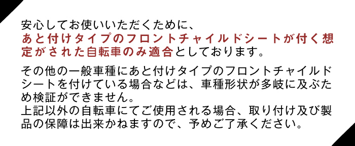 | 適合シート | 【ブリヂストンサイクル・bridgestone】 Bikke ビッケ グリ dd ビッケ モブ dd HYDEE2 ハイディーツー 【パナソニック・panasonic】 ギュット GYUTTO ギュット・アニーズ・EX ギュット・アニーズ・DX ギュット・アニーズ・SX ギュット・アニーズ・DX・26 ギュット・ステージ・22 ギュット・アニーズ・KE NCD336A NCD400 NCD401/NCD391 【ヤマハ・yamaha】 パスバビーアン・pas babby un ハンドル一体型前用シートには対応しません 海外製シートには対応しません。 あと付けタイプのシートが装着されることを想定していない自転車での使用は保証できません。 |