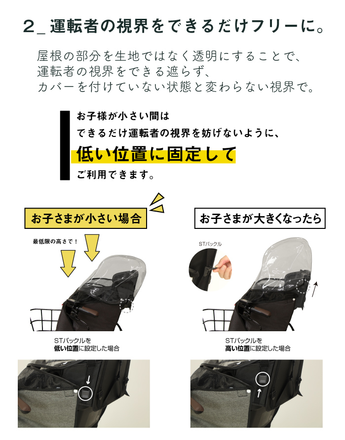| 商品の特徴 | ◇あと付け用チャイルドシートに取り付けできます。 ◇運転者の視界を妨げにくい、透明カバーを採用! ◇雨が上がったら透明上カバーをはずして、蒸れを防ぎます。 ◇検査を行い、合格した安心・安全な生地やパーツだけを使用しています。 ◇乗せ降ろし簡単らくらく ◇豊富なカラーバリエーション |