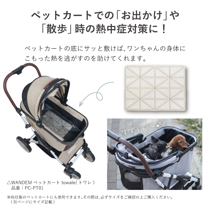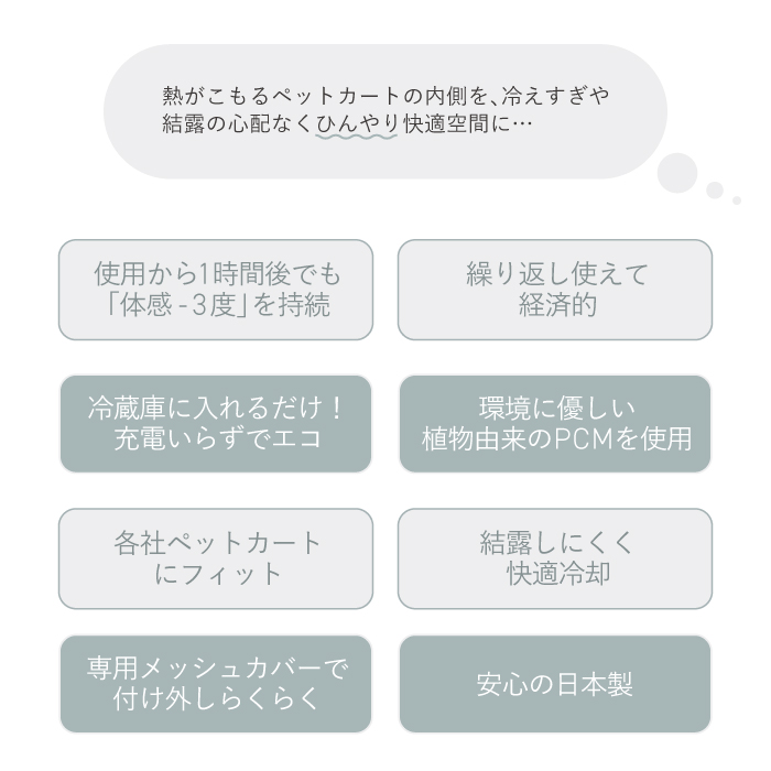 | 商品の特徴 | ・ペットカート専用の冷却パッド ・お出かけ時などの暑さ対策に、熱中症対策としてもご利用できます。 ・使用から1時間後でも体感マイナス3度を維持することができます。 ・冷蔵庫へ入れるだけなので、充電いらずで節電につながります。 ・繰り返し使用することができます。 ・環境にも優しい植物由来のPCMを使用しています。 ・結露しないので、濡れる心配がありません。 ・丈夫なメッシュカバー付きで本体の破れなどを防いでくれます。 |